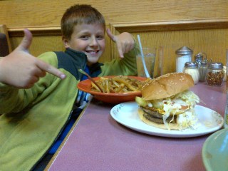 That’s right, a burger soooo big it comes on its own plate, and fries and gravy soooo saucy that they serve it in a bowl. Well after about half an hour, the only thing left was 3 small pieces of meat, and about a quarter of his fries and gravy. WELL DONE Champ!! He has now successfully been promoted up to the FATBOY burger, and the best part of this whole experience, is the story that I know he’ll share tomorrow with his friends at school , and one day with his own children.