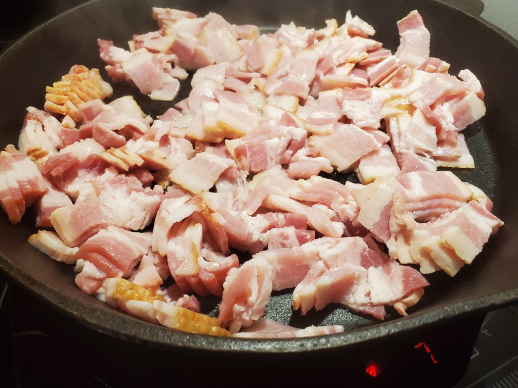 - Meanwhile warm a large 12” skillet (cast-iron works great if you have one) over medium-high heat. Using clean kitchen shears cut bacon into bite size pieces over the skillet and let them to fall into the pan. Stir occasionally as needed. Cook until crisp.