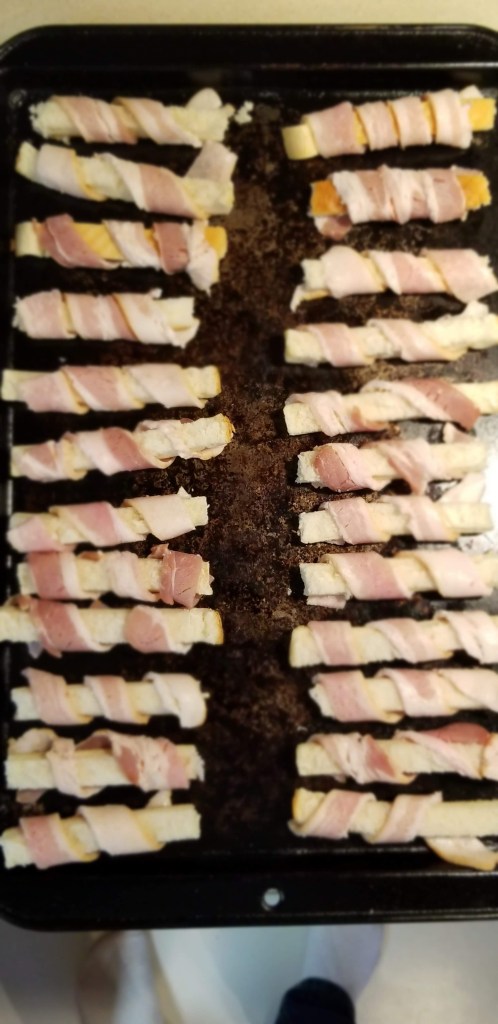 - slice the bacon in half then slice them each half length-ways giving you 4 strips of bacon out of each piece. Wrap a piece around each crust and then place them on a baking tray (picture 3)